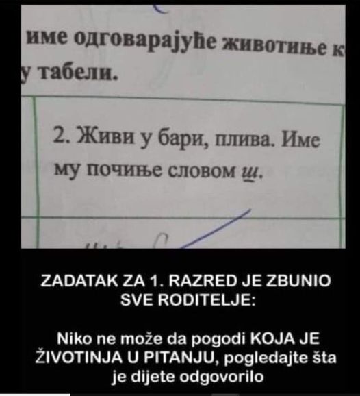 Odgovor djeteta je šaba, a većina roditelja složiće se sa njim. Jer, iako na prvi pogled zadatak djeluje logično, pa biste mogli da kažete nešto poput šaran, štuka, šrac, ova mama kaže da zadatak ne priznaje vrste riba.