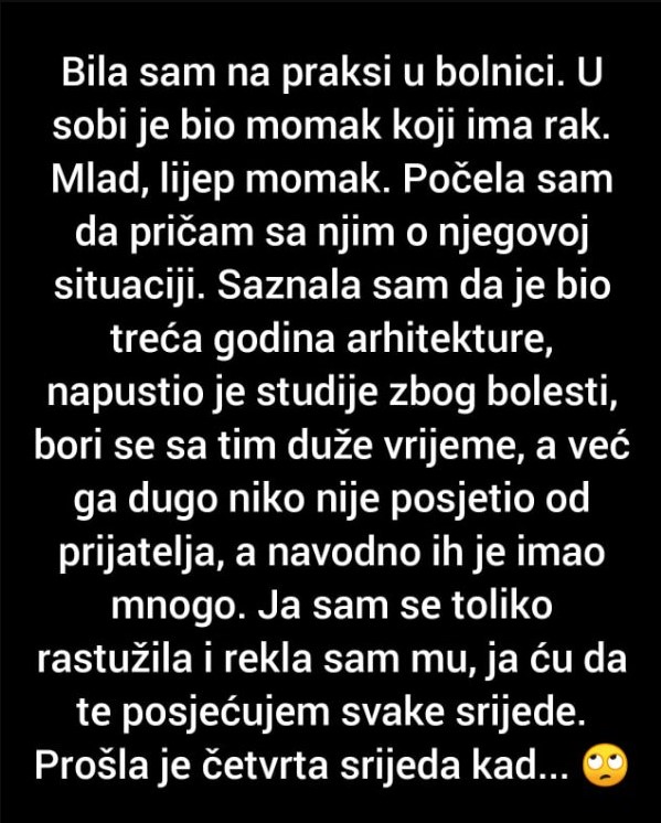 Bila sam na praksi u bolnici. U sobi je bio momak koji ima rak. Mlad, lijep momak. Počela sam da pričam sa njim o njegovoj situaciji. Saznala sam da je bio treća godina arhitekture, napustio je studije zbog bolesti, bori se sa tim duže vrijeme, a već ga dugo niko nije posjetio od prijatelja, a navodno ih je imao mnogo. Ja sam se toliko rastužila i rekla sam mu, ja ću da te posjećujem svake srijede. Redovno igramo šah, rešavamo ukrštene riječi. Prošla je već četvrta srijeda i mislim da sam se zaljubila u njega.