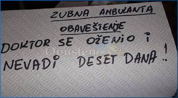 “ZUBNA AMBULANTA OBAVJESTENJE – Doktor se ozenio i ne vadi 10 dana” Vrlo vjerovatno je trebalo pisati “ne radi 10 dana” ali se neko posteno našalio…