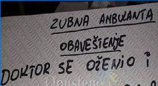 “ZUBNA AMBULANTA OBAVJESTENJE – Doktor se ozenio i ne vadi 10 dana” Vrlo vjerovatno je trebalo pisati “ne radi 10 dana” ali se neko posteno našalio…