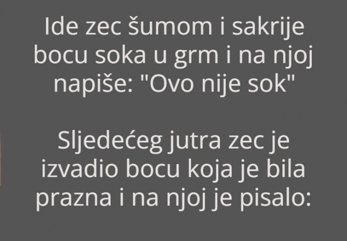 Ide zec šumom i sakrije bocu soka u grm i na njoj napiše: “Ovo nije sok”
