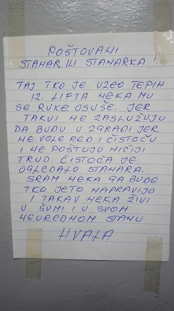 Međutim, čini se da se to nije svidjelo nekome od susjeda. Već nakon kratkog vremena netko ju je razočarao, a ona je odlučila ostaviti poruku ostalim stanarima.