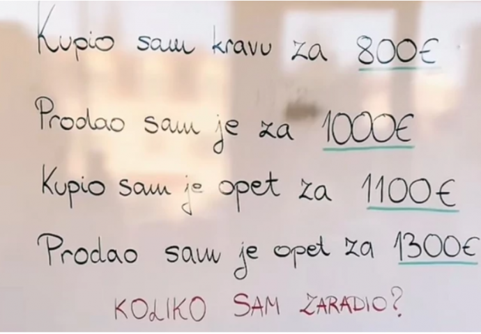 “Kupio sam kravu za 800 eura. Prodao sam je za 1.000 eura. Kupio sam je opet za 1. 100 eura. Prodao sam je opet za 1. 300 eura. Koliko sam zaradio”, glasi postavka.