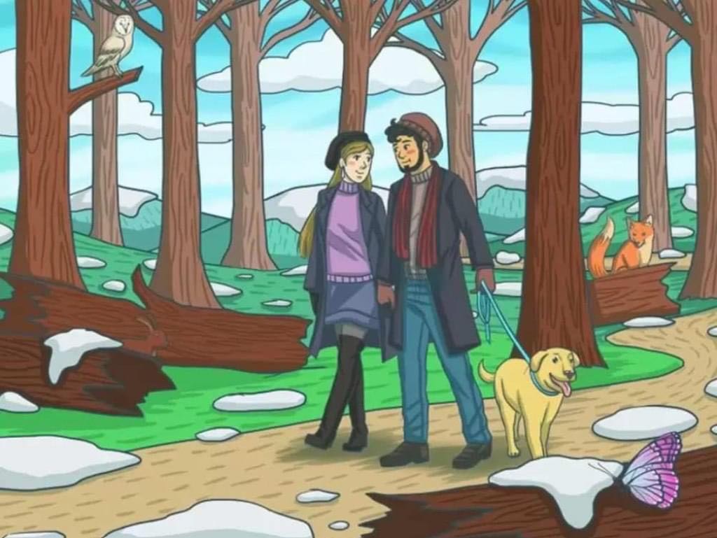 Gornja slika stvorena je kao mozgalica za djecu i odrasle. U ovoj optičkoj iluziji postoji par koji sa svojim psom šeta šumom. U šumi možete vidjeti ružičastog leptira, lisicu i sovu. Međutim, Zec se skriva negdje u šumi.