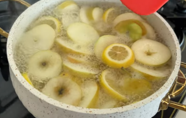 U šerpu sa vodom stavite isjeckane na kolutove 3 jabuke i 2 limuna. Dovedite do ključanja. Za to vrijeme u bokal na dno stavite sjeckanu 1 jabuku i 1 limun, takođe na kolutove. Kada je smjesa provrela voće izvadite na tanjir, a vodu sipajte u bokal. Pustite da se ohladi pa pijte.