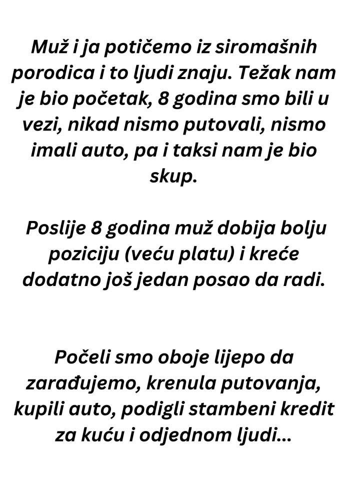 Počeli smo oboje lijepo da zarađujemo, krenula putovanja, kupili auto, podigli stambeni kredit za kuću, i odjednom ljudi su se počeli pitati odakle nam sve to?.. Odakle? To što mi je muž spajao po dvije smjene da bi zaradio za nas i dijete, to što nikada nije bio kod kuće zbog posla, ja također po smjenama.
