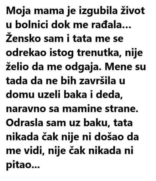 “Moja mama je izgubila život u bolnici dok me rađala… Žensko sam i tata me se odrekao istog trenutka, nije želio da me odgaja. Mene su tada da ne bih završila u domu uzeli baka i deda, naravno sa mamine strane. Odrasla sam uz baku, tata nikada čak nije ni došao da me vidi, nije čak nikada ni pitao za mene…