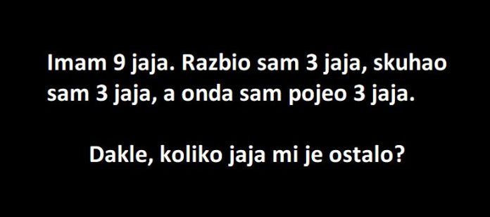 Imam 9 jaja. Razbio sam 3 jaja, skuhao sam 3 jaja, a onda sam pojeo 3 jaja.