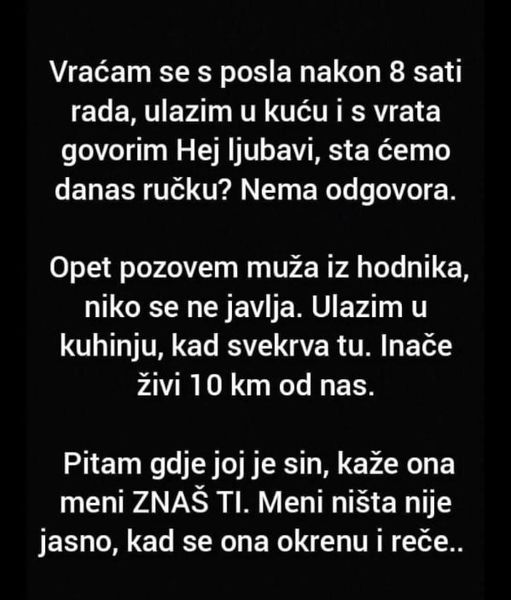 Opet pozovem muža iz hodnika, niko se ne javlja. Ulazim u kuhinju, kad svekrva tu. Inače živi 10 km od nas.