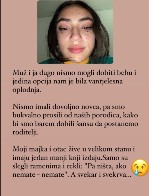 Nismo imali dovoljno novca, pa smo bukvalno prosili od naših porodica, kako bi smo barem dobili šansu da postanemo roditelji. Moji majka i otac žive u velikom stanu i imaju jedan manji koji izdaju.