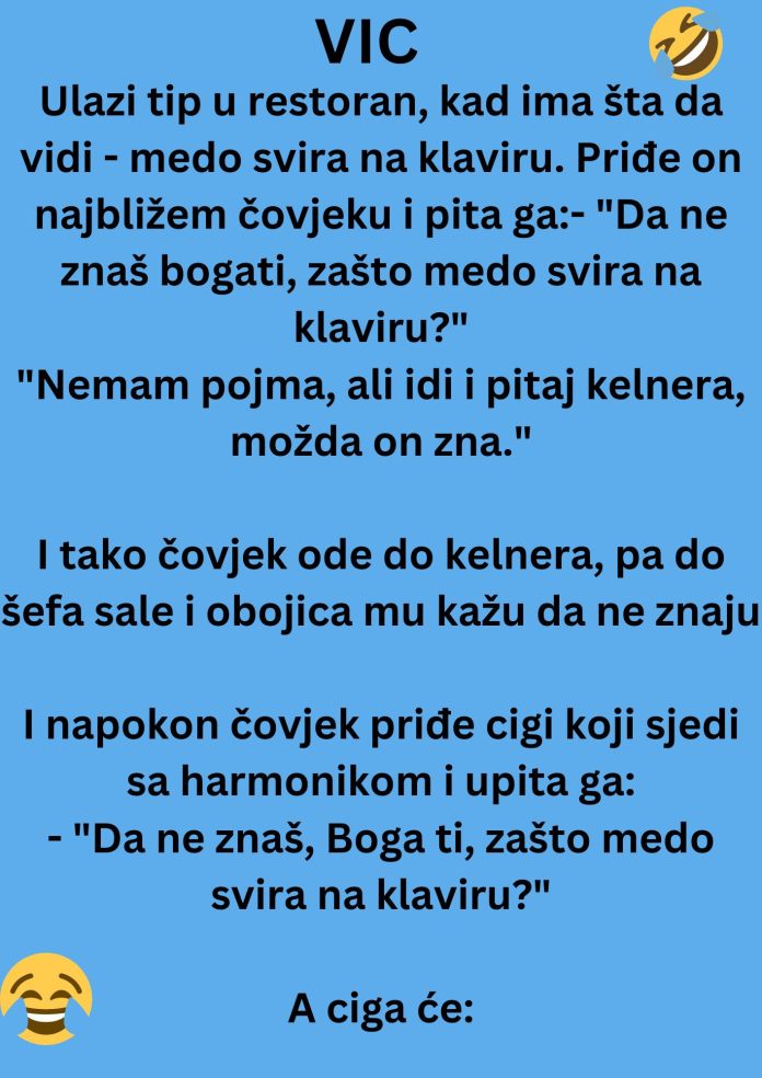 Ulazi tip u restoran, kad ima šta da vidi – medo svira na klaviru. Priđe on najbližem čovjeku i pita ga:- “Da ne znaš bogati, zašto medo svira na klaviru?”