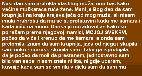 Danas je nezadovoljan kako se ponašam prema njegovoj mamici, MOJOJ SVEKRVI, počeo da viče i krenuo da me šamara, a onda sam prelomila, znam da sam krupnija, jača od njega i skupila sam neku hrabrost, skočila sam i tako ga isprebijala,