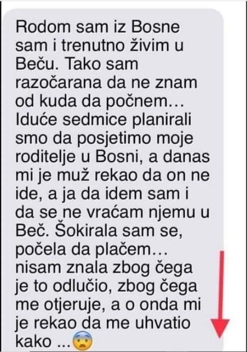 Ustvari kada sam bolje razmislila problem je druge prirode… Naime već 3 godine smo u braku i ja još uvijek nisam rodila nijedno dijete, imam manjih zdravstvenih probleme, a on želi djecu… ne zbog djece, već zbog socijalnih primanja na djecu, a ovo sa 100 eura je našao kao izgovor.”