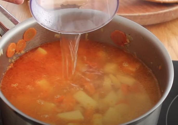 Propržite luk i šargarepu, dodajte krompir isečen na kockice, nalijte vodu, kuvajte, zatim dodajte sok od paradajza i začinite. U krompir čorbu možete dodati i drugo povrće po želji, na primer paprike.