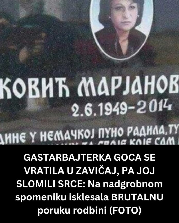 “36 godina u Njemačkoj sam puno radila, tugovala, plakala za domovinom, familijom, za svoje koje sam više voljela od sebe. Danas tri godine u domovini ti za koje sam živjela kažu da ih mrzim, da sam zlobna žena to se vidi po mojim očima zato dižem sama spomenik jer oni nisu dužni da takvoj ženi prave spomenik, koja im je nanijela toliko zla. I pored svega voljeću ih i kad budem umrla”, piše na spomeniku, potpisano sa Goca.