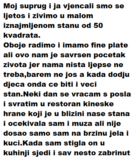 Neki dan se vracam s posla i svratim u restoran kineske hrane koji je u blizini nase stana i ocekivala sam i muza ali nije dosao samo sam na brzinu jela i kuci.Kada sam stigla on u kuhinji sjedi i sav nesto zabrinut kaze mi dodji moramo nesto popricati.