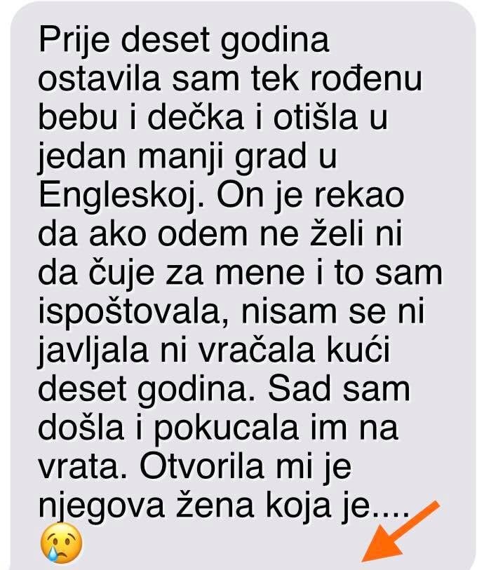 On je rekao da ako odem ne želi ni da čuje za mene i to sam ispoštovala, nisam se ni javljala ni vračala kući deset godina. Sad sam došla i pokucala im na vrata. Otvorila mi je njegova žena koja je trudna s njihovim drugim djetetom i pustila me u kuću (bila je sama, a mi se znamo iz viđenja od prije)