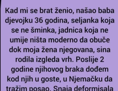 Kad mi se brat ženio, našao baba djeovojku 36 godina, seljanka koja se ne šminka, jadnica koja ne umije ništa moderno da obuče dok moja žena njegovana, sina rodila izgleda vrh.