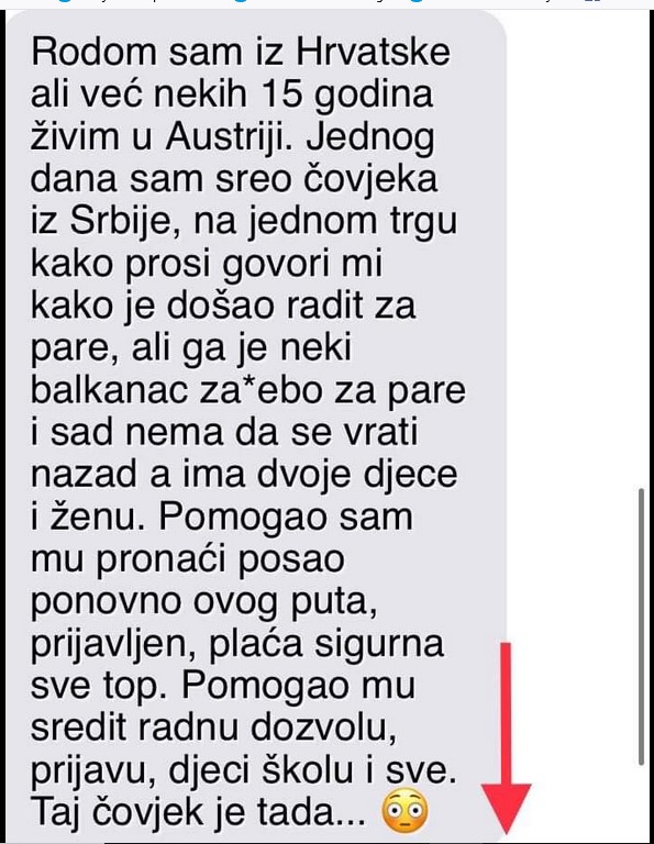 Rodom sam iz Hrvatske ali već nekih 15 godina živim u Austriji. Jednog dana sam sreo čovjeka iz Srbije, na jednom trgu kako prosi govori mi kako je došao radit za pare, ali ga je neki balkanac za*ebo za pare i sad nema da se vrati nazad a ima dvoje djece i ženu. Pomogao sam mu pronaći posao ponovno ovog puta, prijavljen, plaća sigurna sve top.