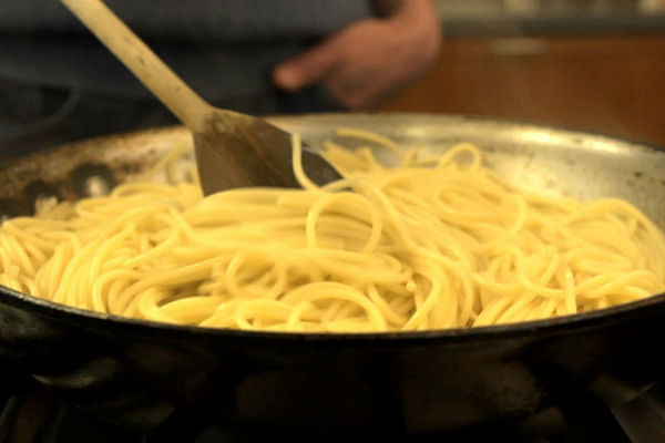 Stavite testeninu u kuvani umak, uključite šporet i dinstajte par minuta. Ako je umak pregust, dodajte mu malo vode u kojoj se kuvala testenina – ona sadrži obilje skroba, obogaćuje ukus umaka i pomaže mu da se bolje zalepi za testeninu.