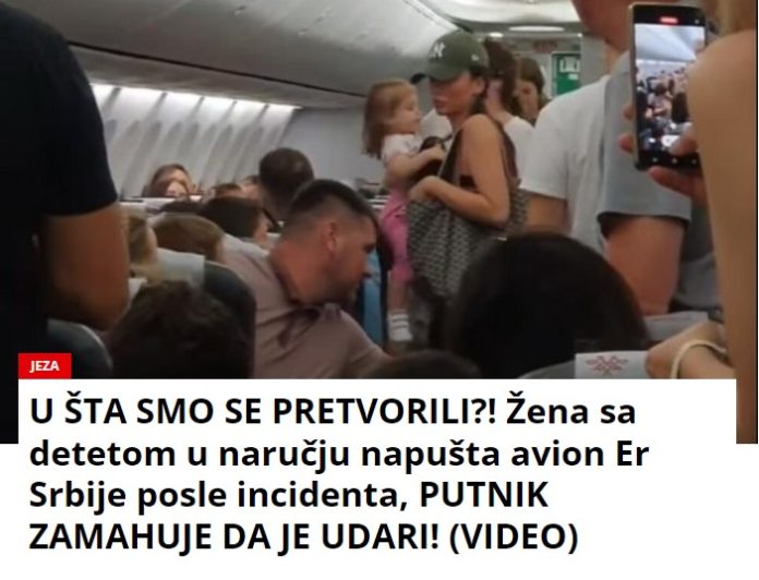 Naime, dok žena sa detetom u naručju izlazi iz aviona, muškarac koji sedi zamahuje da je udari u leđa, uz psovke. Žena se nakratko okrenula i nastavila. Nije najjasnije da li ju je udario, ili zamahnuo, ali njoj je zbog toga umalo ispalo dete iz ruke.
