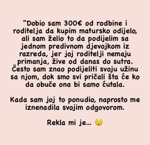 “Dobio sam 300€ od rodbine i roditelja da kupim matursko odijelo, ali sam želio to da podijelim sa jednom predivnom djevojkom iz razreda, jer joj roditelji nemaju primanja, žive od danas do sutra. Često sam znao podijeliti svoju užinu sa njom, dok smo svi pričali šta će ko da obuče ona bi samo ćutala.