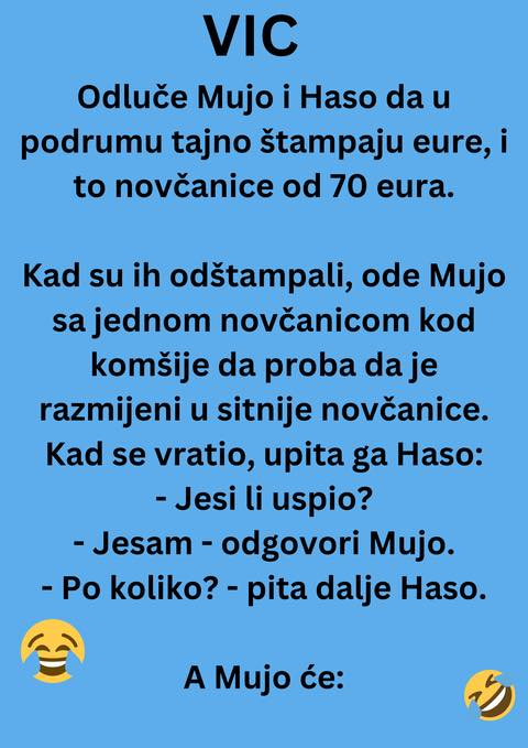 Odluče Mujo i Haso da u podrumu tajno štampaju eure, i to novčanice od 70 eura.
