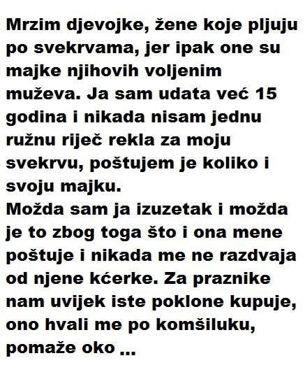 Mrzim djevojke, žene koje pljuju po svekrvama, jer ipak one su majke njihovih voljenim muževa. Ja sam udata već 15 godina i nikada nisam jednu ružnu riječ rekla za moju svekrvu, poštujem je koliko i svoju majku.Možda sam ja izuzetak i možda je to zbog toga što i ona mene poštuje i nikada me ne razdvaja od njene kćerke. Za praznike nam uvijek iste poklone kupuje, ono hvali me po komšiluku, pomaže oko djece, pogotovo kada sam se porađala.