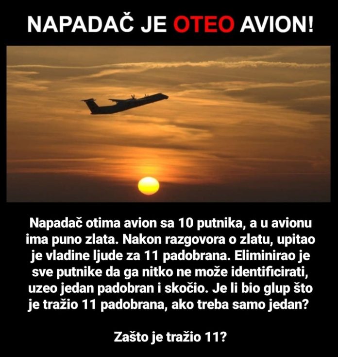 Napadač otima avion sa 10 putnika, a u avionu ima puno zlata. Nakon razgovora o zlatu, upitao je vladine ljude za 11 padobrana. Eliminirao je sve putnike da ga nitko ne može identificirati, uzeo jedan padobran i skočio. Je li bio glup što je tražio 11 padobrana, ako treba samo jedan? Zašto je tražio 11?