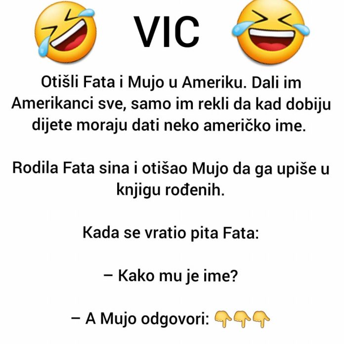 Otišli Fata i Mujo u Ameriku. Dali im Amerikanci sve, samo im rekli da kad dobiju dete moraju dati neko američko ime. Rodila Fata sina i otišao Mujo da ga upiše u knjigu rođenih.