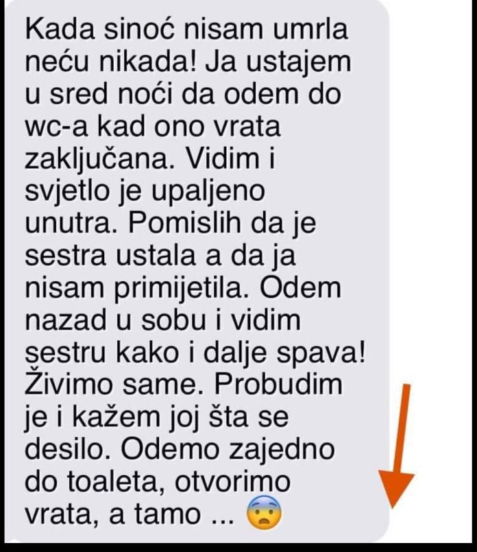 Kada sinoć nisam umrla neću nikada! Ja ustajem u sred noći da odem do wc-a kad ono vrata zaključana.Vidim i svjetlo je upaljeno unutra. Pomislih da je sestra ustala a da ja nisam primijetila.