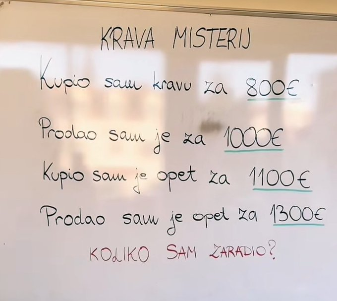 „Kupio sam kravu za 800 evra. Prodao sam je za 1.000 evra. Kupio sam je opet za 1. 100 evra. Prodao sam je opet za 1. 300 evra. Koliko sam zaradio“, glasi postavka.