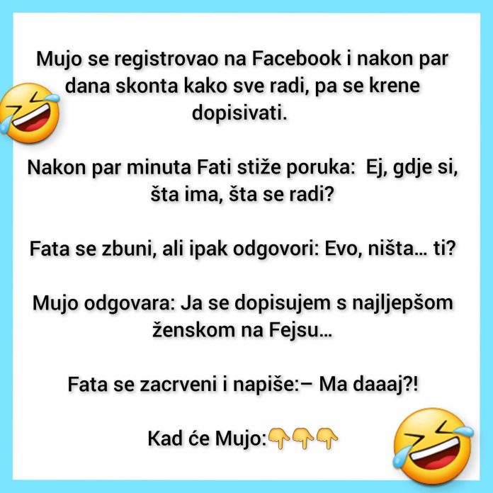 Mujo se registrovao na Facebook i nakon par dana skonta kako sve radi, pa se krene dopisivati. Nakon par minuta Fati stiže poruka: