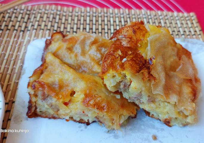Jaja umutiti žicom, a na dno podmazanog pleha staviti tanku koru, premazati je uljem, pa dodati još tri korice. Na četvrtu staviti pola smese od mesa i krompira. Ide opet 4 kore, pa meso i 4 kore namazane uljem.