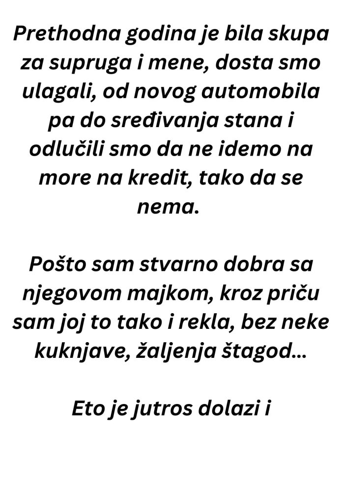 Prethodna godina je bila skupa za supruga i mene, dosta smo ulagali, od novog automobila pa do sređivanja stana i odlučili smo da ne idemo na more na kredit, tako da se nema. Pošto sam stvarno dobra sa njegovom majkom, kroz priču sam joj to tako i rekla, bez neke kuknjave, žaljenja štagod…