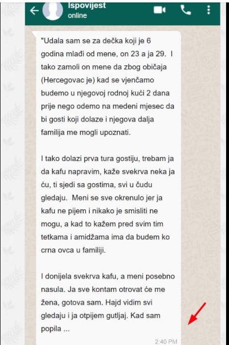 I donijela svekrva kafu, a meni posebno nasula. Ja sve kontam otrovat će me žena, gotova sam. Hajd vidim svi gledaju i ja otpijem gutljaj.Kad sam popila …