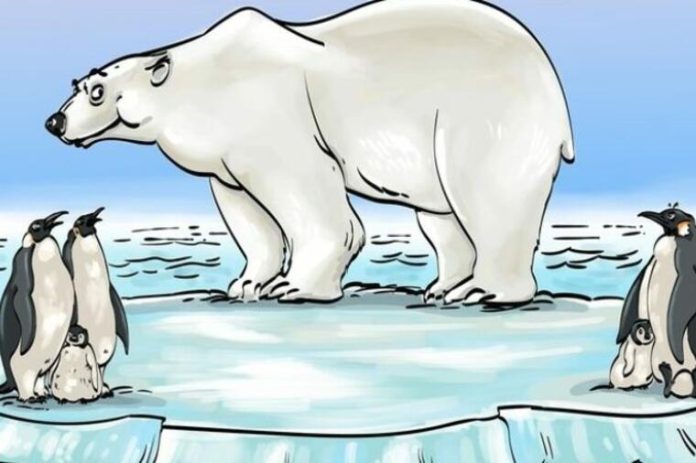 Na slici se vide polarni medveda i pet pingvina nasukanih zajedno na plutajuću santu leda, a imate 5 sekundi da uočite šta nije u redu sa ovom fotografijom.