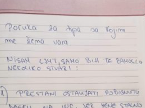 1. Molim te da prestaneš da ostavljaš podignutu dasku na WC šolji jer stalno mene krivi za to.