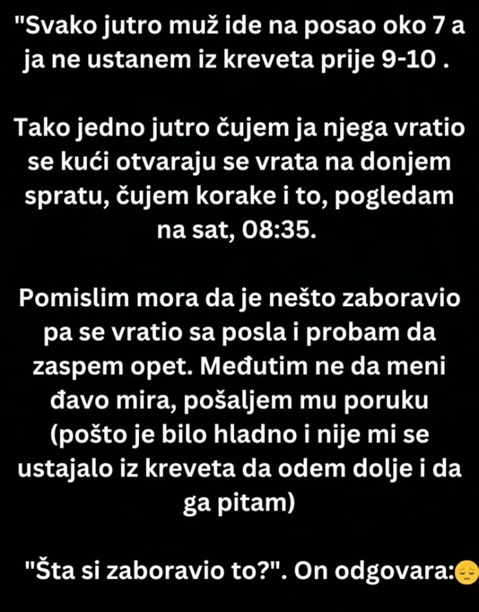 Pomislim mora da je nešto zaboravio pa se vratio sa posla i probam da zaspem opet. Međutim ne da meni đavo mira, pošaljem mu poruku (pošto je bilo hladno i nije mi se ustajalo iz kreveta da odem dolje i da ga pitam)