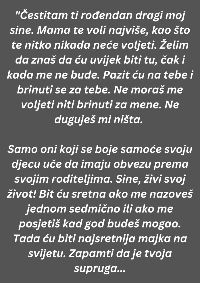 Cestitam ti rođendan dragi moj sine. Mama te voli najviše, kao što te nitko nikada neće voljeti. Želim da znaš da ću uvijek biti tu, čak i kada me ne bude. Pazit ću na tebe i brinuti se za tebe. Ne moraš me voljeti niti brinuti za mene. Ne duguješ mi ništa.