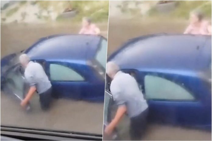 Kako se vidi na snimku objavljenom na Tviteru (Platforma X), stariji muškarac i žena zaglavili su se zajedno sa svojim vozilom u vodenoj bujici. Očajnički su pokušavali da izvuku vozilo, ali je voda nadirala u njega i nisu mogli da ga pomjere.