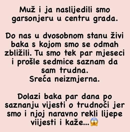 Muž i ja naslijedili smo garsonjeru u centru grada. Do nas u dvosobnom stanu živi baka s kojom smo se odmah zbližili. Tu smo tek par mjeseci i prošle sedmice saznam da sam trudna. Sreća neizmjerna.