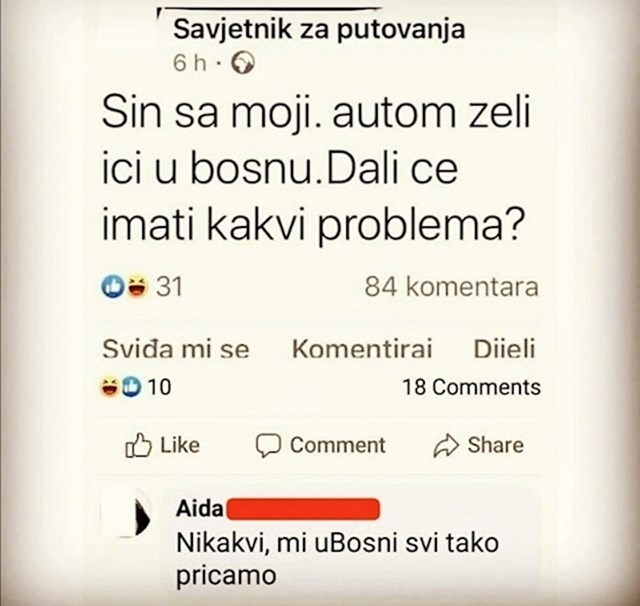 Ovom čovjeku sin je odlučio putovati u Bosnu, ali njegovim automobilom. Zato je u jednoj grupi na Facebooku odlučio ispitati je li netko imao slična iskustva, a odgovor koji je napisala jedna Aida naprosto je urnebesan. 🤣