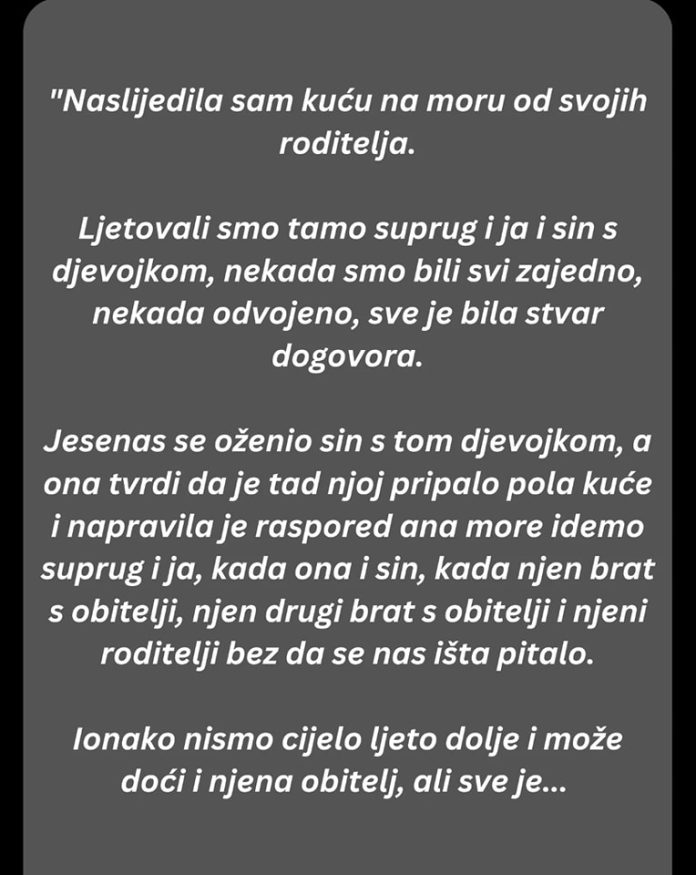Jesenas se oženio sin s tom djevojkom, a ona tvrdi da je tad njoj pripalo pola kuće i napravila je raspored kada na more idemo suprug i ja, kada ona i sin, kada njen brat s obitelji, njen drugi brat s obitelji i njeni roditelji bez da se nas išta pitalo.