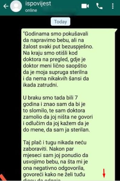 Godinama smo pokušavali da napravimo bebu, ali na žalost svaki put bezuspješno. Na kraju smo otišli kod doktora na pregled, gdje je doktor meni lično saopštio da je moja supruga sterilna i da nema nikakvih šansi da ikada zatrudni.