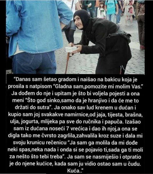 “Danas sam šetao gradom i naišao na bakicu koja je prosila s natpisom “Gladna sam,pomozite mi molim Vas.” Ja dođem do nje i upitam je sto bi voljela pojesti a ona meni “Što god sinko,samo da je hranjivo i da će me to držati do sutra”
