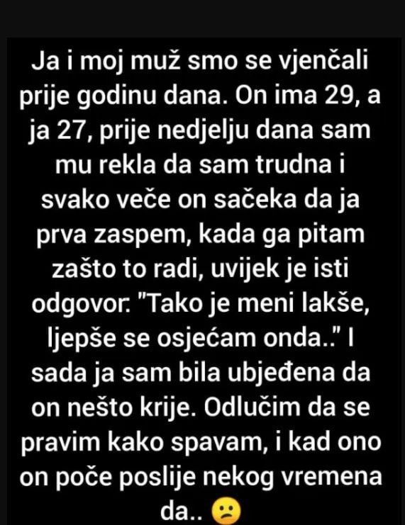 Ja i moj muž smo se venčali pre godinu dana. On ima 29, a ja 27, pre nedelju dana sam mu rekla da sam trudna i svako veče on sačeka da ja prva zaspem, kada ga pitam zašto to , uvijek je isti odgovor: