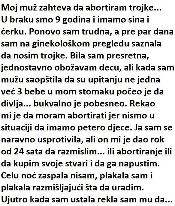 Rekao mi je da moram abortirati jer nismo u situaciji da imamo petero djece. Ja sam se naravno usprotivila, ali on mi je dao rok od 24 sata da razmislim… ili abortiranje ili da kupim svoje stvari i da ga napustim. Celu noć zaspala nisam, plakala sam i plakala razmišljajući šta da uradim. Ujutro kada sam ustala rekla sam mu da ga volim najviše na svetu, ali da tri nevina bića ne mogu tek tako UBITI. Spakovala sam svoje stvari i otišla kod roditelja. Iskreno već 3 dana kako sam ga napustila i mnogo mi fali i on, ali posebno naša deca koja su ostala kod njega.