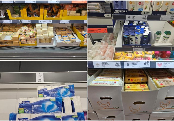 Foto: Vlada.hrIz prošlog paketa cijene ostaju zamrznute za suncokretovo ulje, mlijeko, brašno, šećer, cijelo pile i svinjsko mljeveno meso. Među novim su proizvodima s ograničenim cijenama jogurt u čašici i bočici koji sada stoji 0,49 eura, zatim polutvrdi sir gauda – blok za rezanje koji je 6,49 eura, riža, špageti, svježa jaja razred M, svinjski vrat bez kosti, juneći vrat s kosti, hrenovke pileće ili pureće, hamburger kilogram, krumpir, mrkva u rinfuzi, šareni grah u rinfuzi, pasirana rajčica tetrapak od 500 ml, limun u rinfuzi po kilogramu, jabuka “Gala” u rinfuzi te mliječna čokolada, sirup sa šećerom, pasta za zube, gel za tuširanje, šampon, troslojni toaletni papir, higijenski ulošci, pelene…