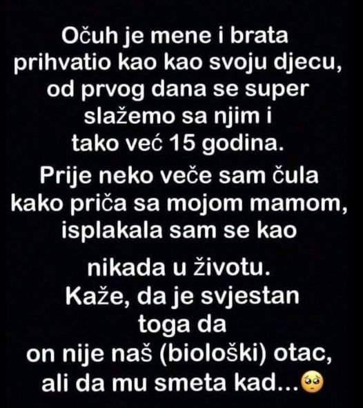 Prije neko veče sam čula kako priča sa mojom mamom, isplakala sam se kao nikada u životu. Kaže, da je svjestan toga da on nije naš (biološki) otac, ali da mu smeta kad ga ljudi podsećaju na to.